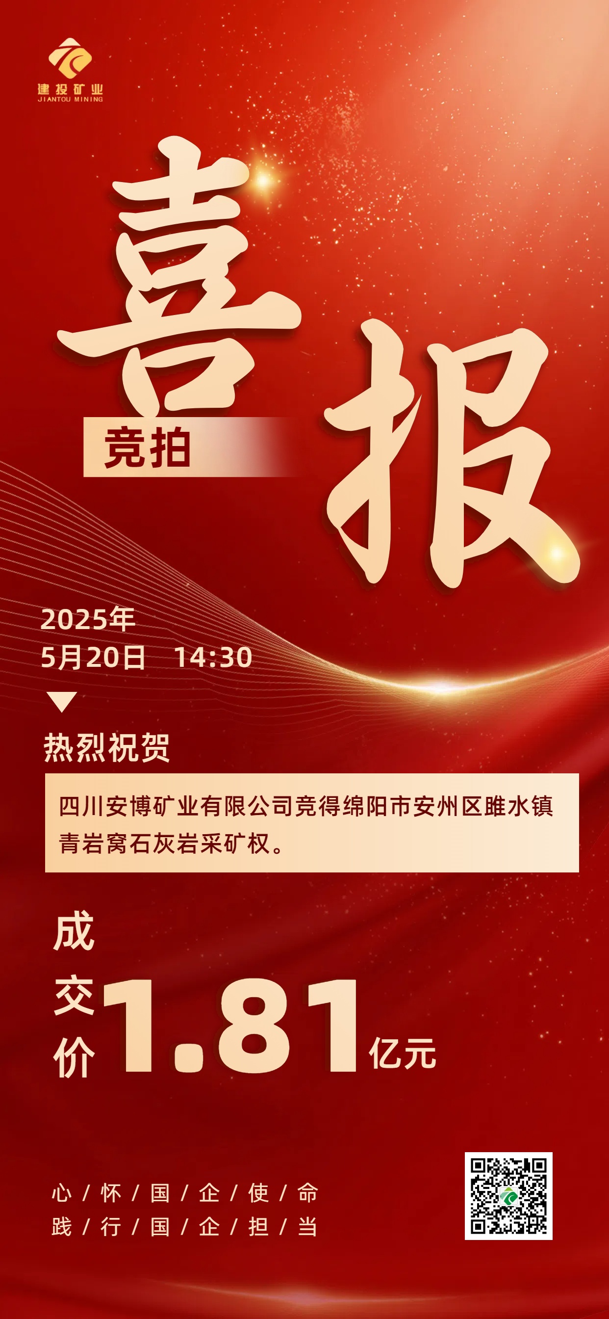 喜報|綿陽安州礦產資源集團有限公司下屬子公司四川安博礦業(yè)有限公司競得綿陽市安州區(qū)雎水鎮(zhèn)青巖窩石灰?guī)r采礦權
