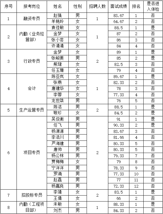 根據(jù)《綿陽安州礦產(chǎn)資源集團有限公司公開招聘(智聯(lián))2022年度工作人員面試工作方案》相關(guān)規(guī)定,現(xiàn)將面試成績、排名及是否進入體檢公示如下: